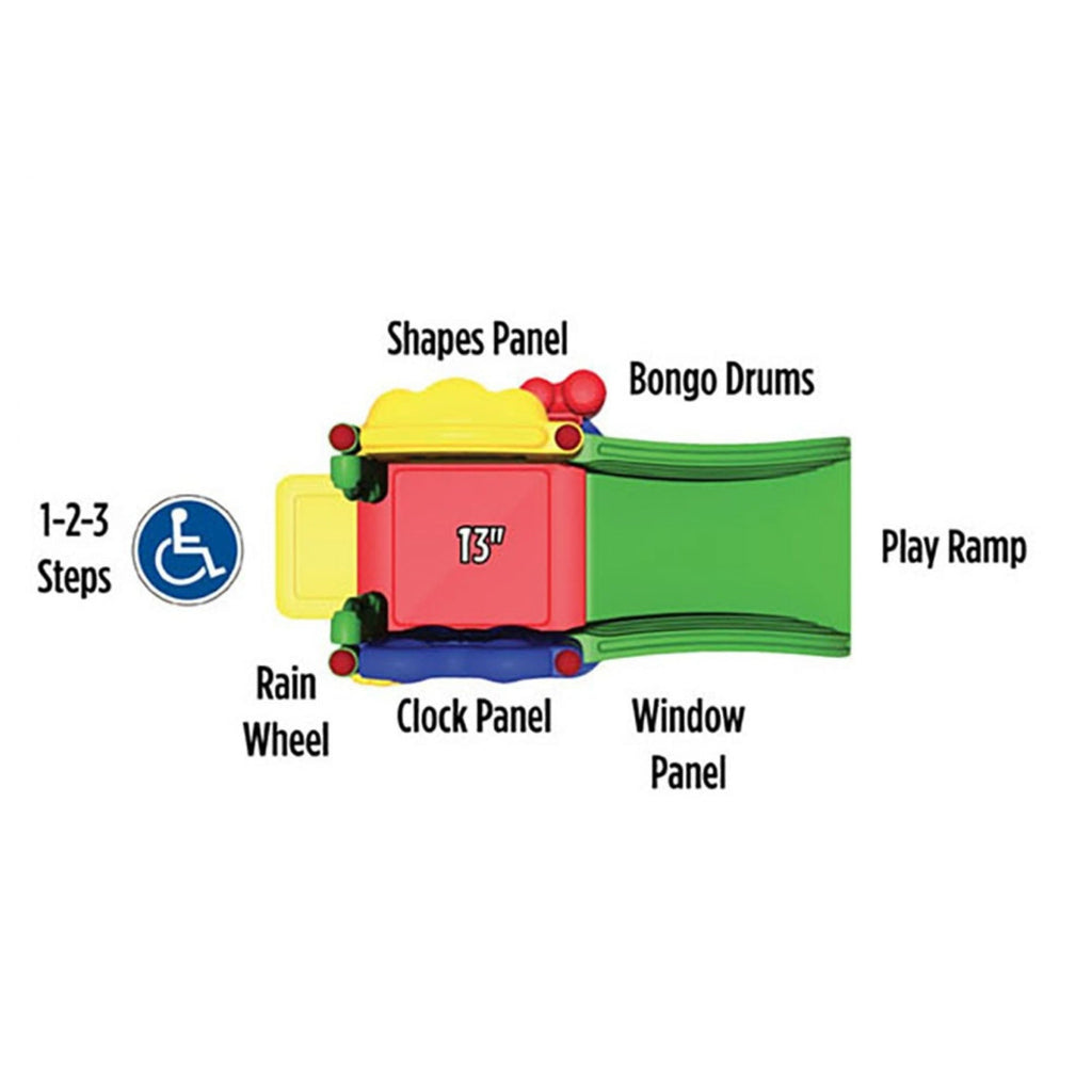 The Discovery Center Super Sprout offers a fun and developmentally supportive play experience for children ages 6 to 23 months. This single-deck structure includes a versatile play ramp that fosters early developmental milestones. The ramp sides display engaging visuals like animals, shapes, letters, and numbers to promote early language and counting skills.