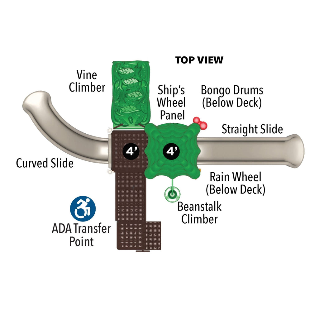 Hawk’s Nest brings fun to new heights with a mix of active climbing, sensory music play, and imaginative features—all in a compact footprint. Ideal for ages 2–5 or 5–12, it includes a 4′ Vine Climber, Beanstalk Climber, and both Straight and Curved Slides. The Ship’s Wheel Panel and ground-level Rain Wheel and Bongo Drums add inclusive play for children of all abilities.