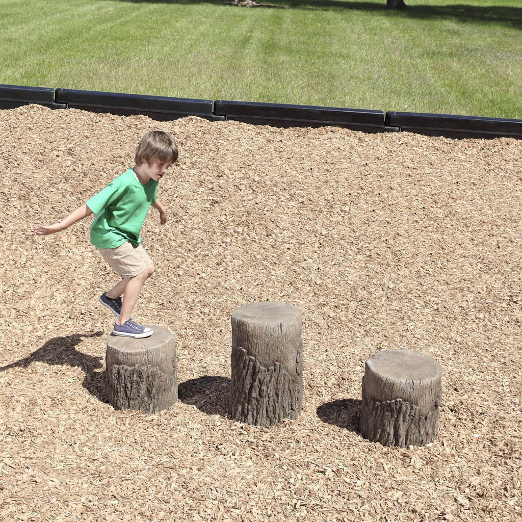 Challenge coordination and balance with this set of three playground steppers designed at varying heights. Each Tree Stump Stepper is hand painted to resemble natural wood, complete with realistic bark and grain textures, adding a touch of nature to your play environment.