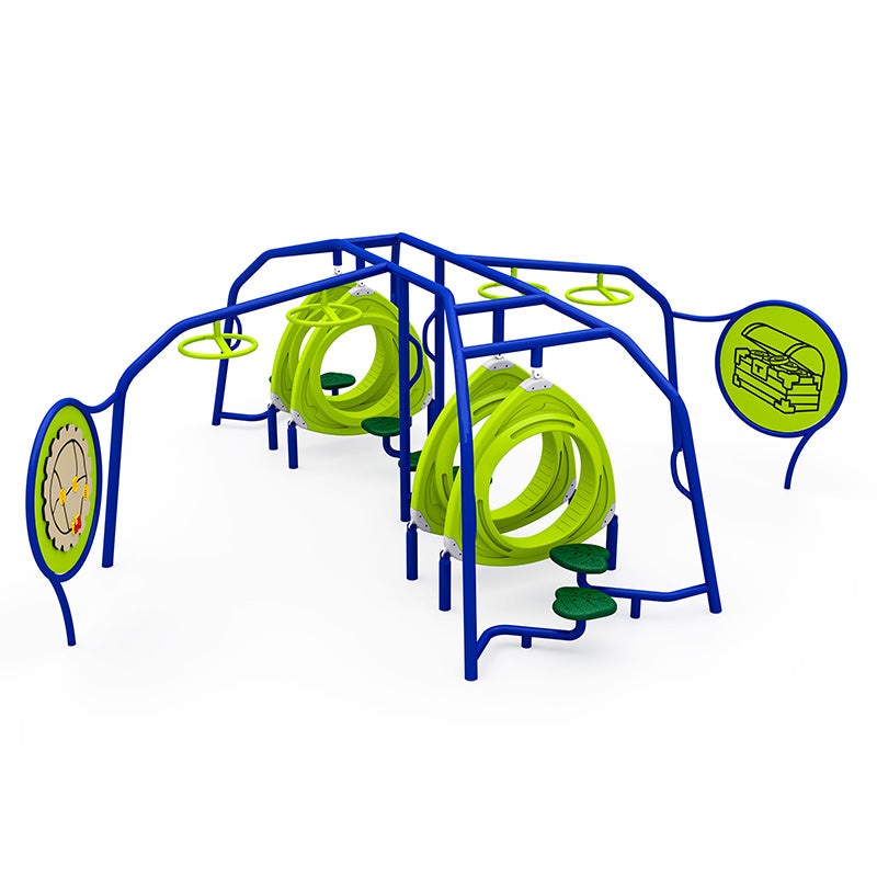 Central to the design are dual rotational crawl tunnels supported by a durable powder-coated steel frame. Surrounding these are step pods, overhead rings, and textured grip elements that offer varied entry points and climbing challenges. Ground-level activity panels add cognitive engagement while enhancing ADA accessibility and usability for children with mobility devices.
